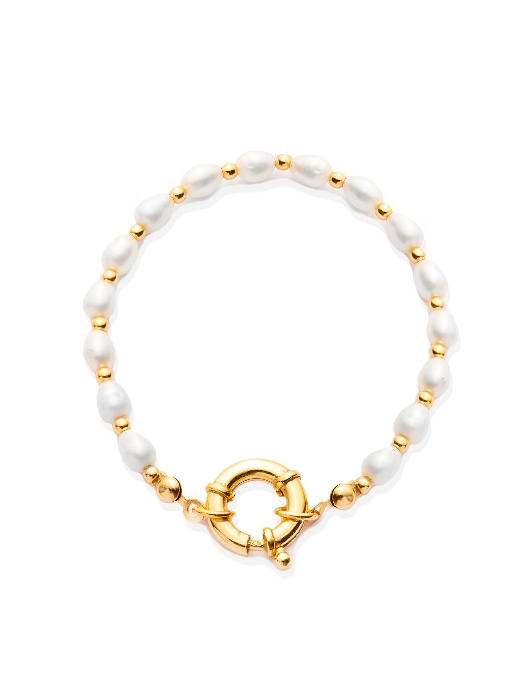 New Arrival! This beautiful bracelet is crafted from 18ct Gold Vermeil Sterling Silver, and features a series of alternating freshwater pearls and gold beads, finished with a great chunky clasp that gives a nautical vibe. Available in two lengths, Petite (17cm) or Regular (19cm) this 18ct gold vermeil pearl bracelet is a great addition to your jewellery collection. Wear alone or layer with your favourite pieces, this piece makes a great gift for that someone special. Why not pair with other pieces from the Aphrodite Pearl Collection for a coordinated look.