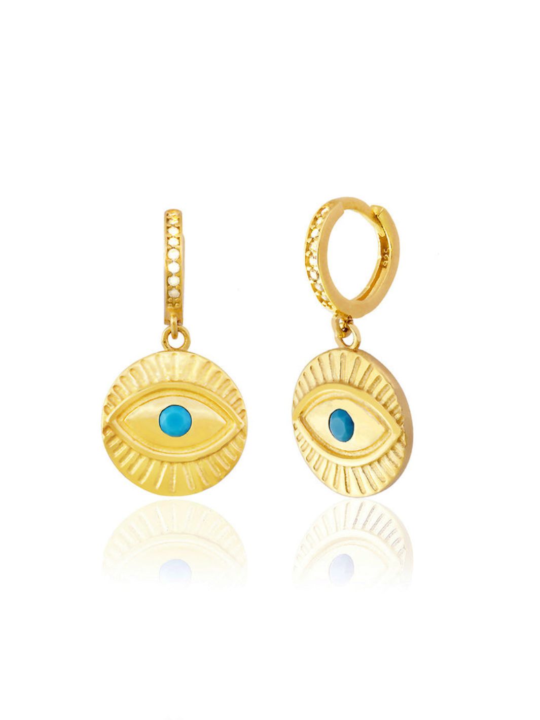 Crafted from 18ct gold vermeil sterling silver, these drop earrings showcase disc charms embellished with an evil eye design. The huggie hoop style is accented with sparkling pavé cubic zirconia. Pair with our Evil Eye necklace for a coordinated look.