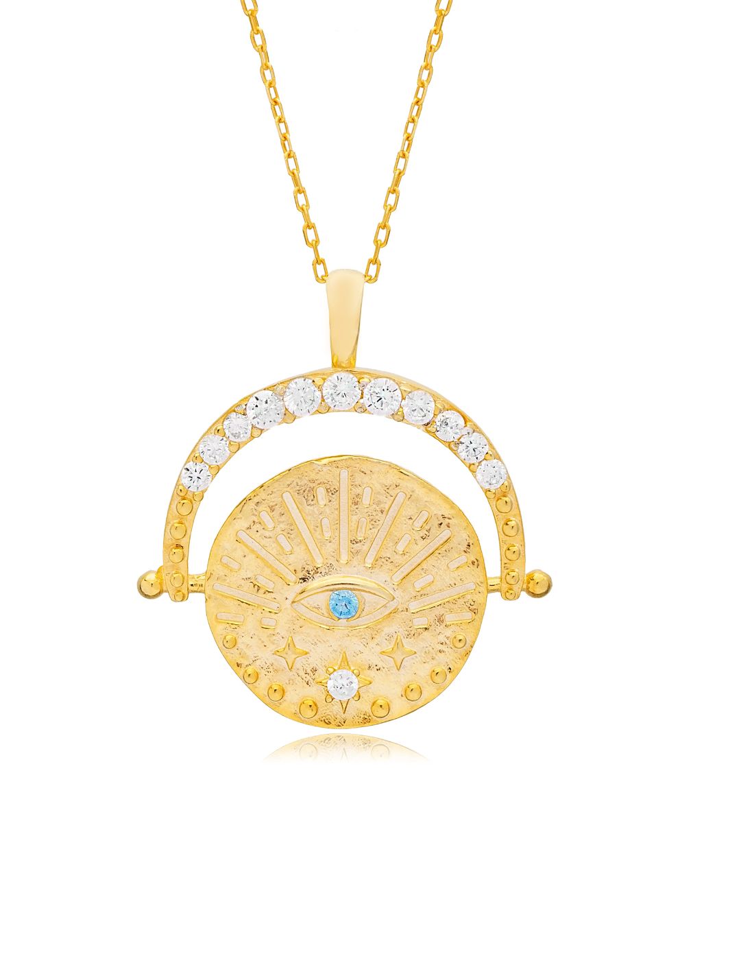 This gold mediallion necklace is new to the Evil Eye Collection. Beautifully handcrafted in 18ct Gold Vermeil Sterling Silver, this antique-feel coin pendant features an evil eye motif and sparkles with white and blue cubic zirconia stones. One of our favourite pieces this season!