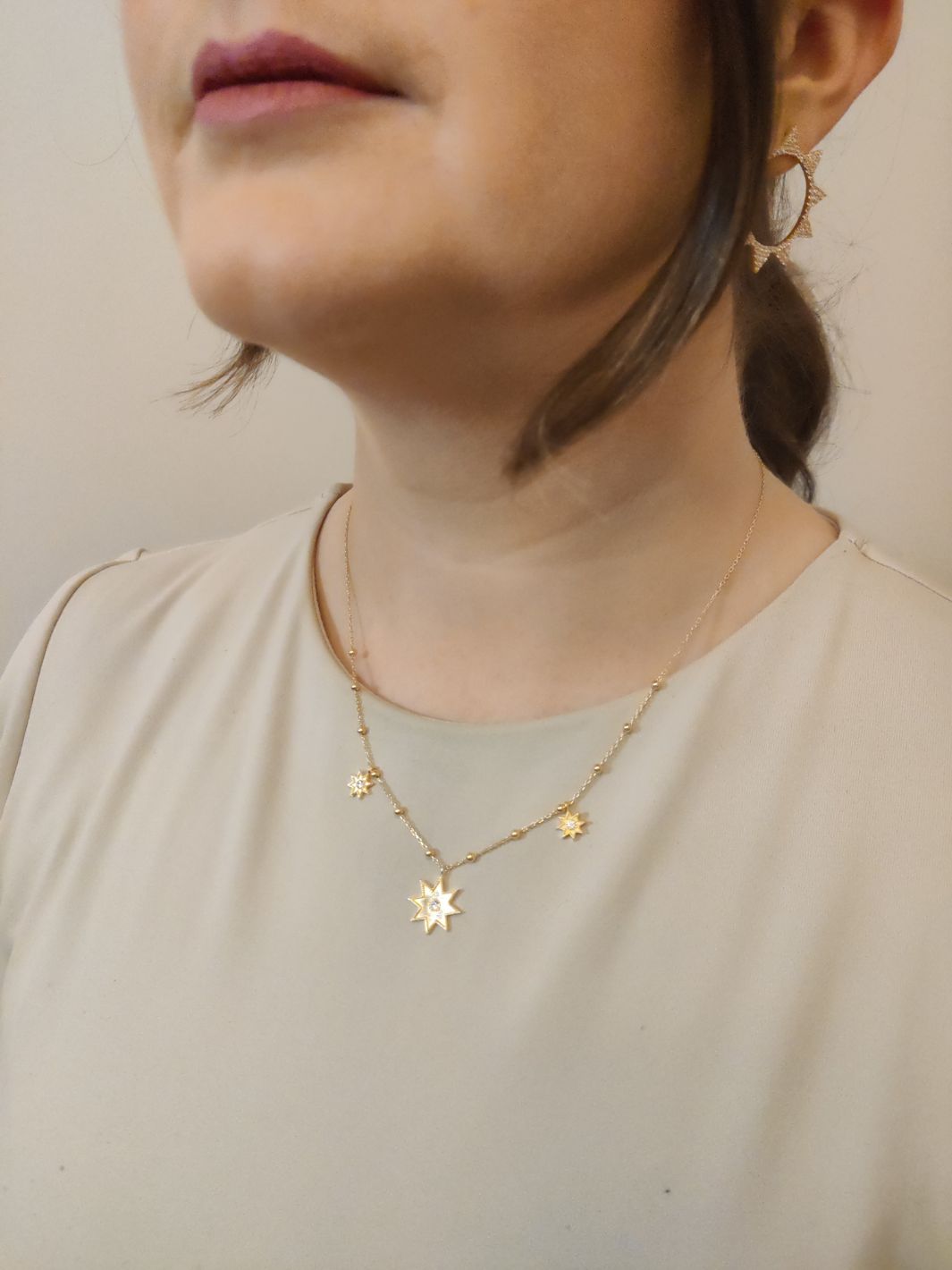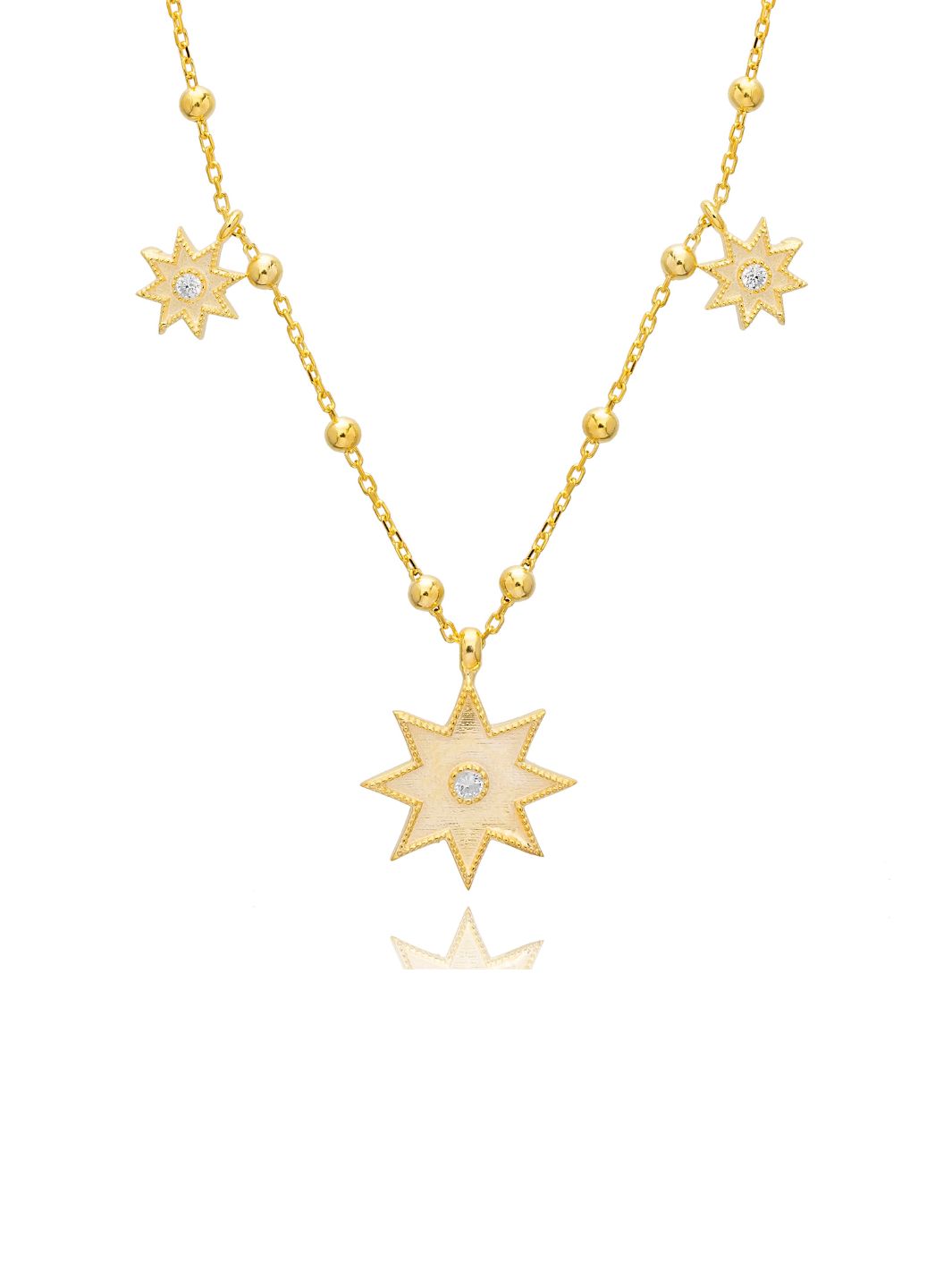 A gorgeous new addition to our North Star Collection. Featuring three star charms on a ball design chain, this beautiful necklace is crafted in 18ct Gold Vermeil Sterling Silver and measures 40cm length, with a 5cm chain extension. Wear alone to add a touch of celestial glamour to any outfit, this necklace also works so well layered with other neck pieces for a custom look.