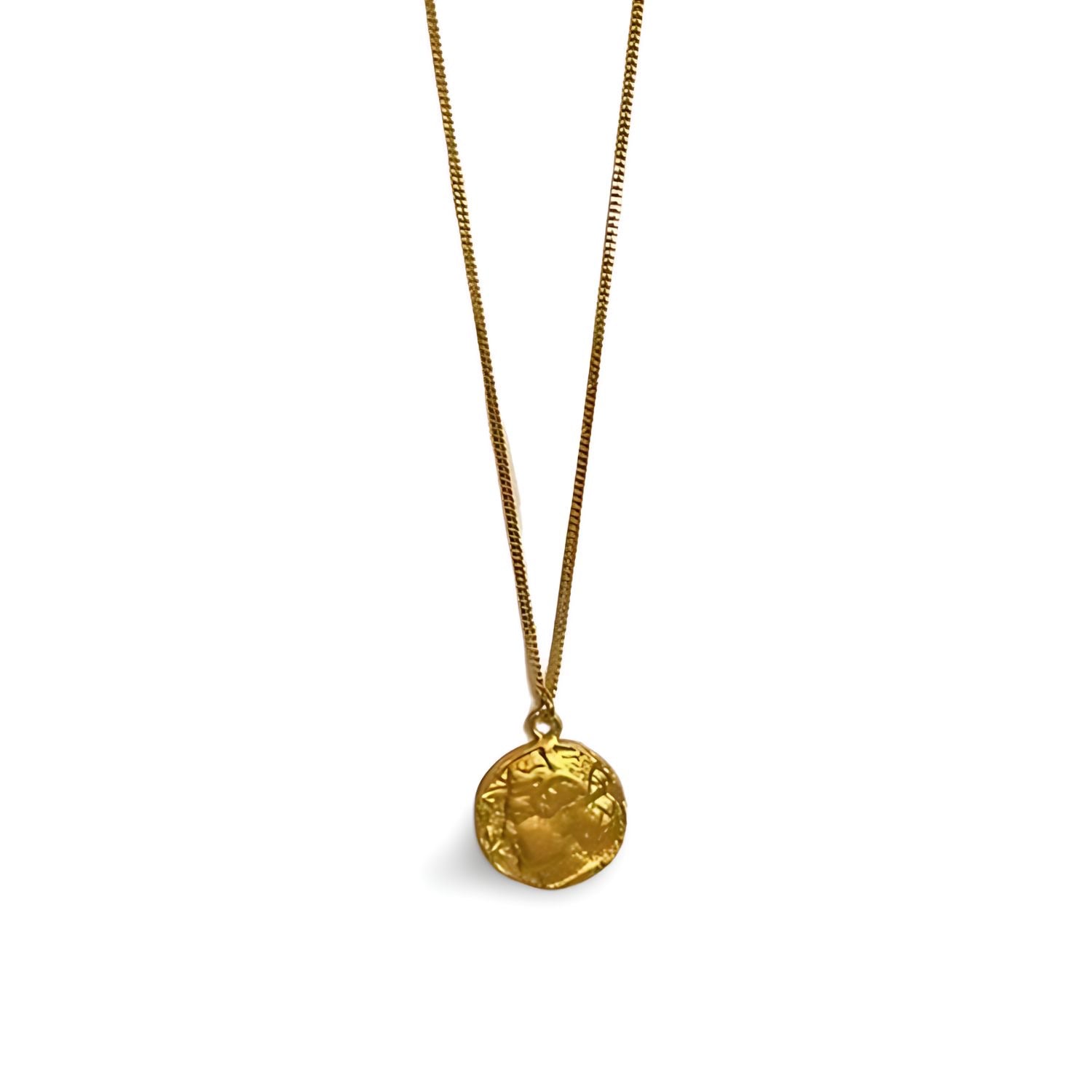 Our Gold Fortuna Roman Coin necklace is such a timeless piece for your collection. The coin pendant features a Roman inspired head with a brushed finish which adds to it's antique feel. Crafted in 18ct Gold Vermeil Sterling Silver with a beautiful tight curb chain.