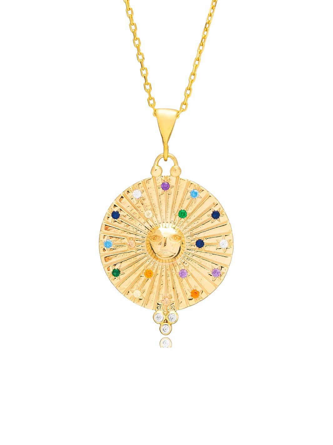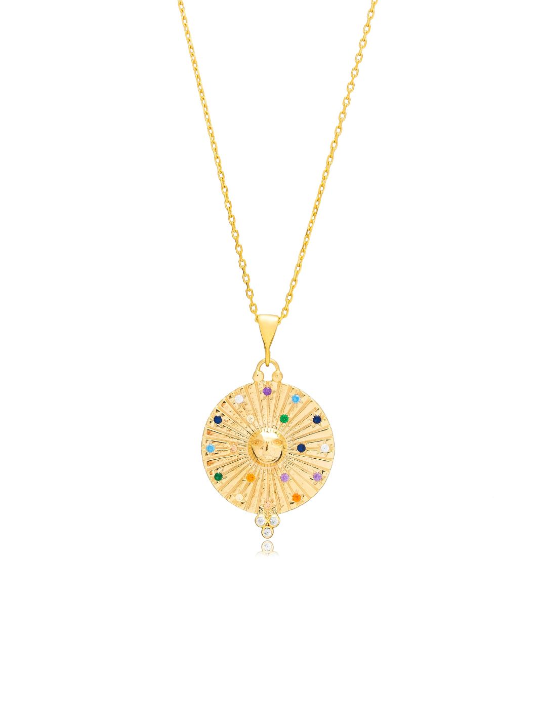 New Arrival! This gorgeous Theia coin necklace depicts the sun surrounded by planets, and is crafted from 18ct Gold Vermeil Sterling Silver and features a rainbow of delicate cubic zirconia stones. Exquisitely hand-crafted, this is such a versatile necklace and will elevate any outfit. Also available in Sterling Silver.