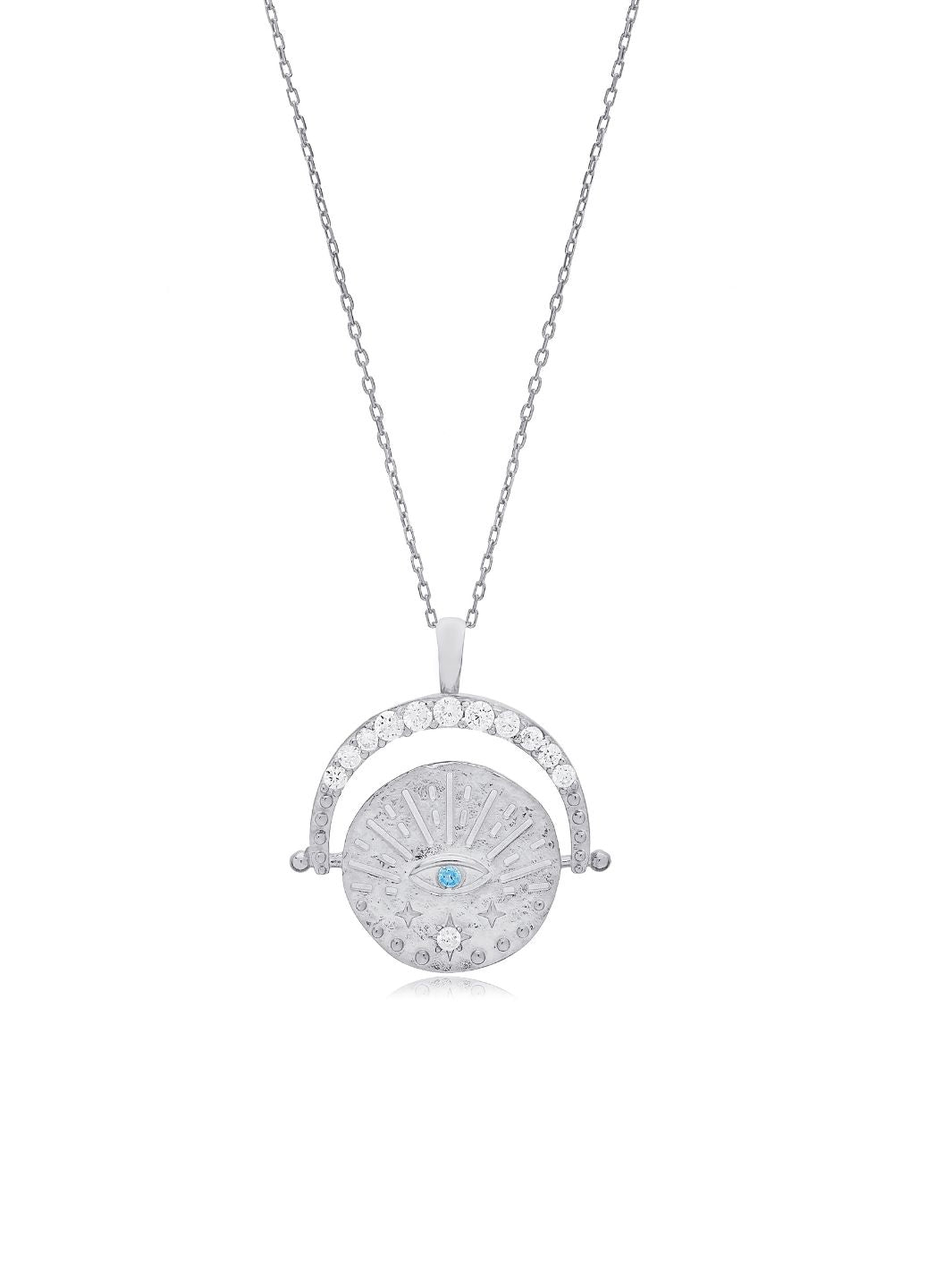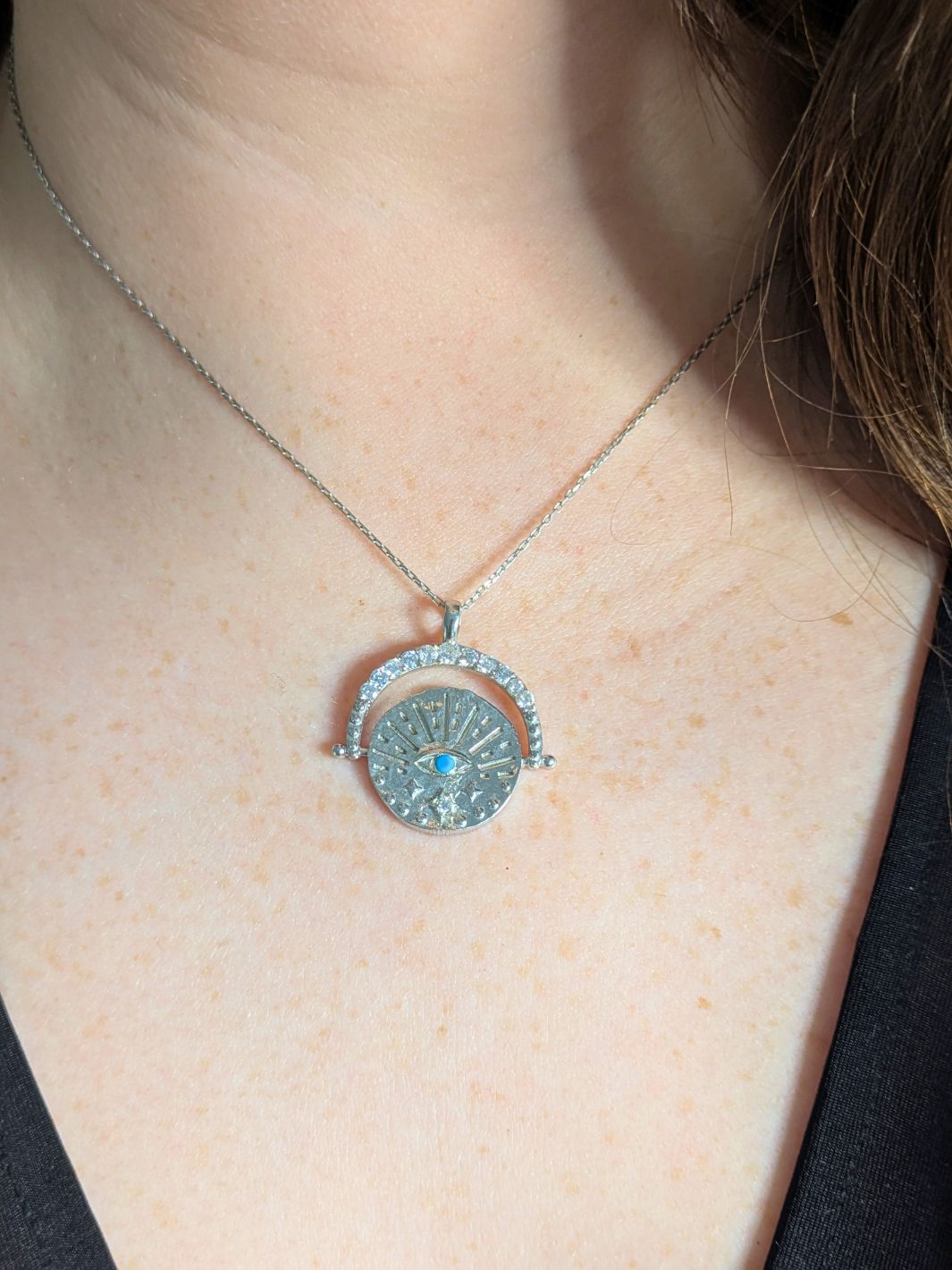 This gold mediallion necklace is new to the Evil Eye Collection. Beautifully handcrafted in Sterling Silver, this antique-feel coin pendant features an evil eye motif and sparkles with white and blue cubic zirconia stones. One of our favourite pieces this season!