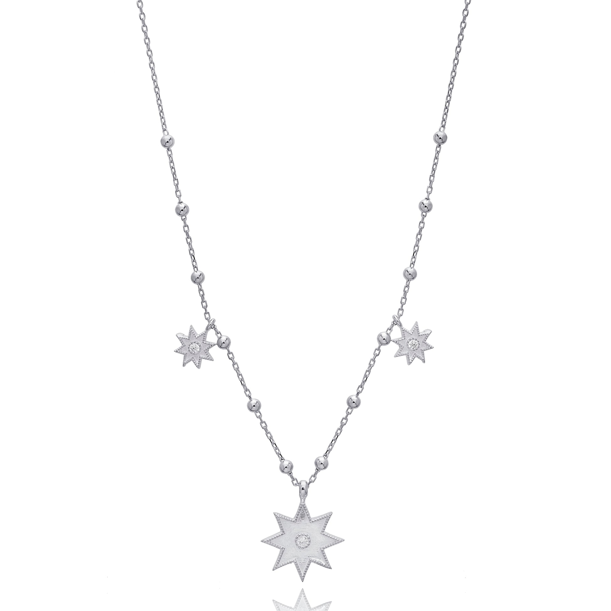 A gorgeous new addition to our North Star Collection. Featuring three star charms on a ball design chain, this beautiful necklace is crafted in Sterling Silver and measures 40cm length, with a 5cm chain extension. Wear alone to add a touch of celestial glamour to any outfit, this necklace also works so well layered with other neck pieces for a custom look.